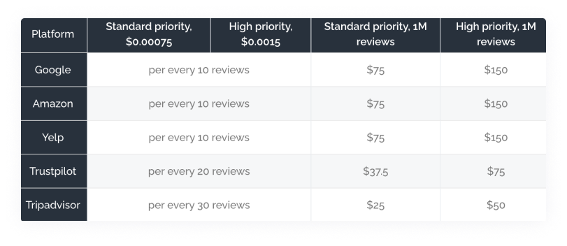 We charge $0.00075 or $0.0015 for a number of reviews specific to the selected platform as shown below. The price also depends on the selected priority of task processing. High-priority tasks return data within 1 minute, while standard-priority tasks take up to 45 minutes to populate the requested info.
