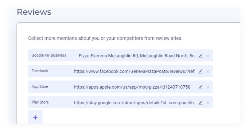 BrandMentions monitors social media sites like Twitter, Facebook, Pinterest, Reddit, and Quora, and collects data from reviews published on Google My Business (now Google Business Profile), App Store, and Play Store.